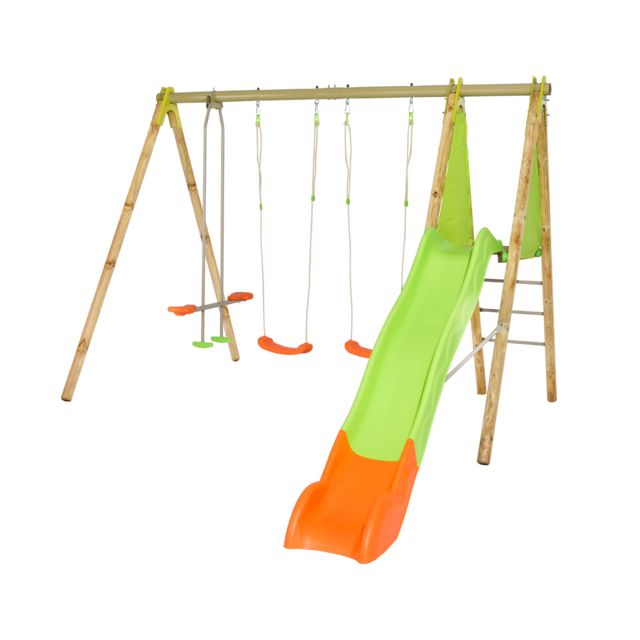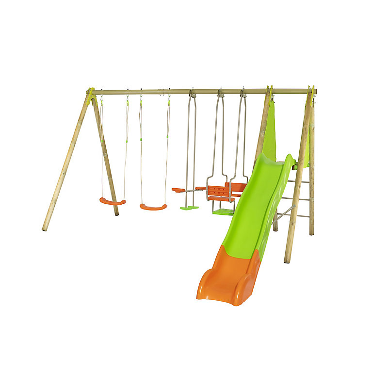 TRIGANO Portique bois et métal KAHUNA - 230m - 2 balançoires 1 face à face 1 nacelle et 1 toboggan 263m