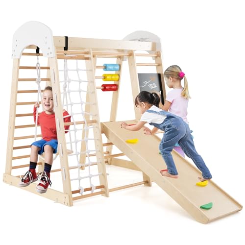 GOPLUS 8 en 1 Aire de Jeu Portique Escalade Enfant en Bois avec Toboggan,Chevalet, Mur&Filet&Barre& Échelle Escalade Échelle Balançoire, Jeu de Calcul pour Enfants 3 Ans + 124x119x138cm (Coloré)