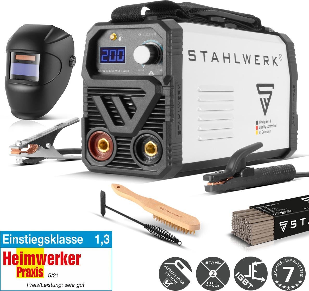 STAHLWERK Poste à souder à électrodes ARC 200 MD - sans gaz avec 200 A, MMA (E-Hand), refroidissement intelligent, protection contre la surchauffe, démarrage automatique à chaud, anti-broutage