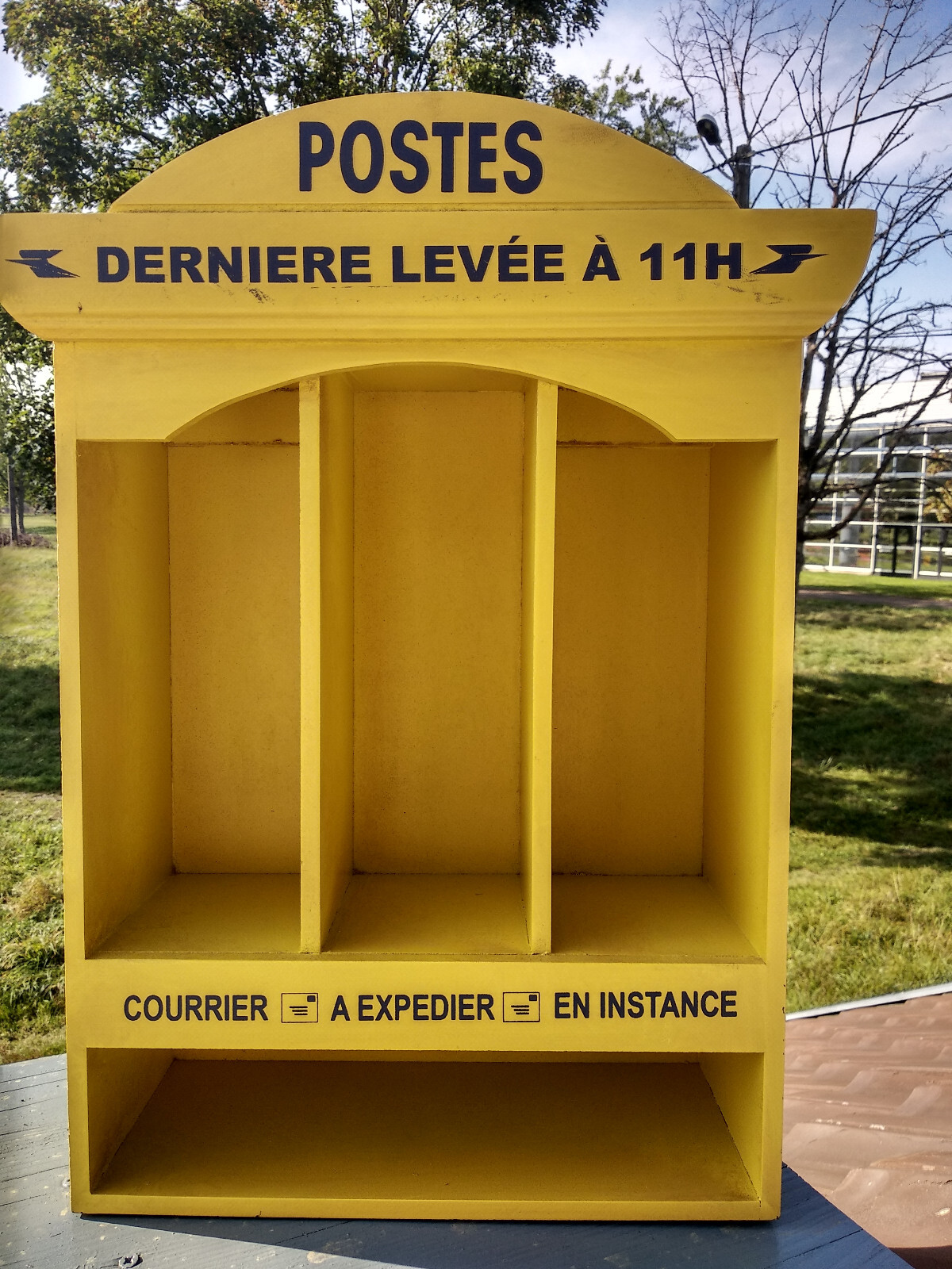 Range courrier mural Poste dernière levée a 11h en bois 49x37, 4 casiers,vintage
