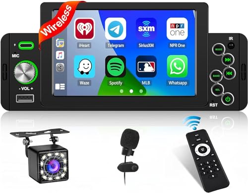 Hikity EQ FM Radio Carplay sans Fil Autoradio 1 DIN Android Auto Wireless, Écran Tactile Poste Radio Voiture Bluetooth 5 Pouces avec Mirror Link, USB/Type-C +Caméra de Recul