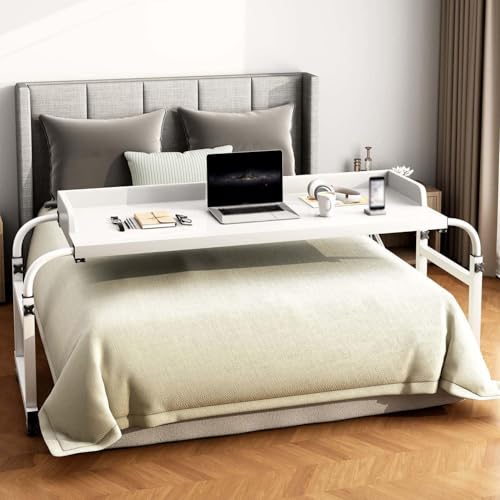 SXZenSpace Table de lit à roulettes réglable en Hauteur, Bureau d'ordinateur, Poste de Travail Debout, Plateau Repas, Usage médical, pour Lits Simples, Doubles, Queen et King Size, Blanc