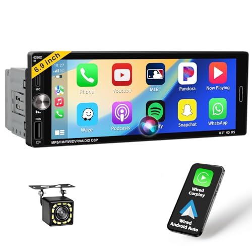 Hikity 1 Din Autoradio sans Fil CarPlay Android Auto 6.9" Écran Tactile Poste Radio Voiture, Bluetooth, Lien Miroir, pour iOS/Android FM Radio EQ AUX/USB + Caméra de recul