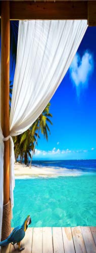 A.Monamour Sticker Porte Autocollant Poster de Porte 3D Perroquet Vue Mer Plage Caraïbes sur des Planches De Bois Rideau Vinyle Affiche de Porte Sticker Mural Papier Peint Art Décor 77 x 200 cm
