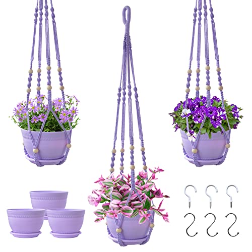 Checrxy Lot de 3 suspensions en macramé avec pot - Pour plantes d'intérieur - Corde en coton faite à la main - Décoration d'intérieur bohème - Idée cadeau pour tout le monde - Comprend des supports de