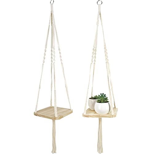 Uposao Plante Cintre Macramé Suspension Corde Plante Macramé Pot de Fleur Titulaire avec Plateau en Bois Plante Cintre Intérieur Extérieur Décoration, Jambes en Corde Coton avec Frange