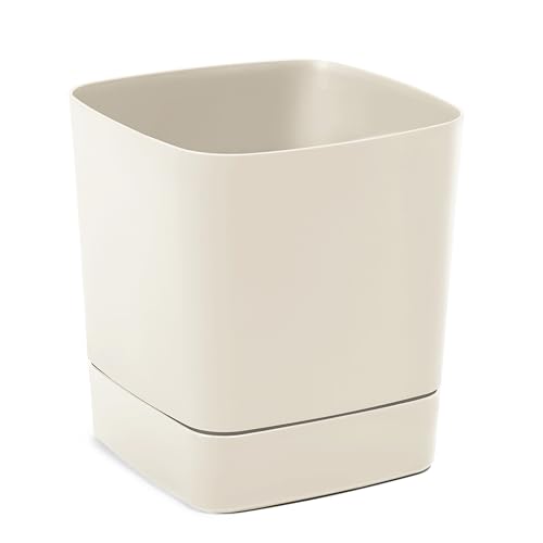 LAMELA Pot Carré avec Soucoupe Intégrée - 25 x 25 cm x 27,5 cm, 8 L - Plastique léger et résistant - Intérieur et extérieur - Beige