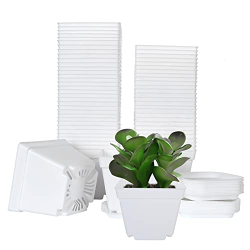 MNKNENG 60Pcs 4 inch Square Plastic Nursery Pots White Small Plant Pots Seedling Pot Container Thicker Plastic Flower Pot for Small Plants and Seedlings, Saucers Included