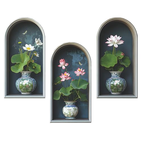 Auriselle 3 pièces 21 * 39CM Fleurs de lotus Autocollants muraux Plante pot Vases 3D Décoration murale autocollante avec plantes vertes et feuilles - Tableau mural moderne salon bureau hôtel cuisine