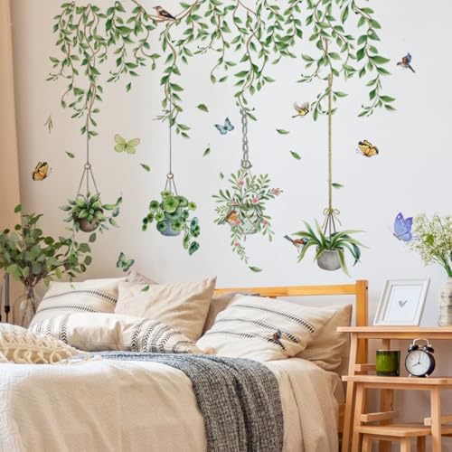 Lekabee vert plante feuilles décalcomanies murales, plante en pot papillon autocollants d’art mural pour bureau chambre salon salle de classe fêtes décoration