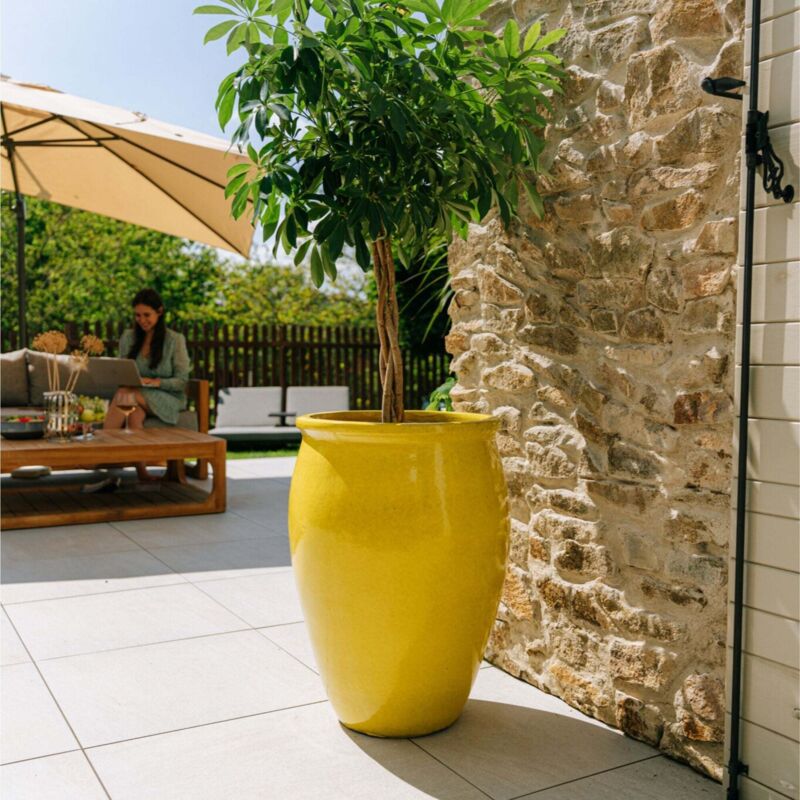 Pot grande taille d'extérieur BACCHUS 36x52cm jaune, fait main en terre cuite émaillée, résistant au gel
