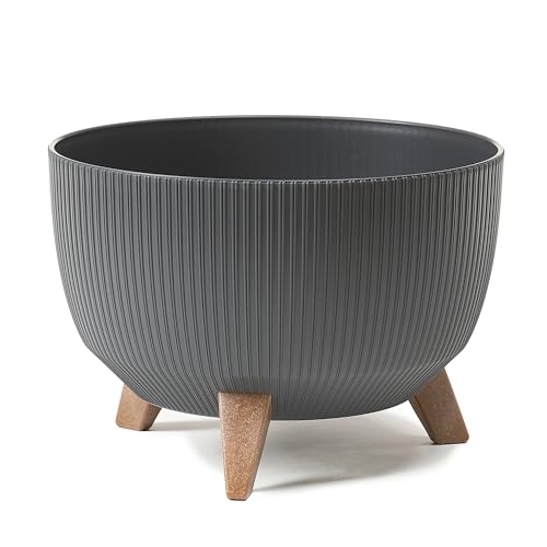 LAMELA Pot de Fleurs Rond sur Pieds - Plastique Rayé - Ø 29 cm x H 18,3 cm, 9,3 L - Résistant et Facile d'entretien - Intérieur et Extérieur - Anthracite