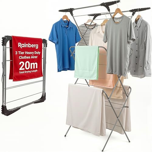 Rainberg Séchoir à Linge à 3 Niveaux pour intérieur et extérieur, avec Pieds antidérapants et espaces d'angle pour cintres, Pliable à Plat pour économiser de l'espace, Espace de séchage de 20 m