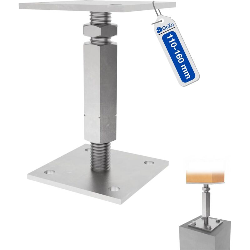 Pied de poteau carré réglable galvanoplastie 100 x 100 mm – hauteur ajustable 120 à 160 mm avec platine bois pour clôtures – GeZu Impex