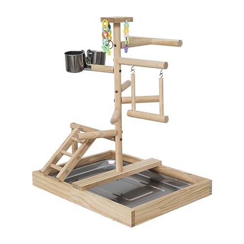 Parc à oiseaux - Poteau vertical escalier balançoire - Avec plateau et tasse en acier inoxydable amovibles et cintre en bois | Pour poser, ronger, grimper et affûter des accessoires pour cage
