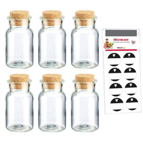 Westmark Ensemble de Pots à Épices Avec Bouchons en Liège, 6 Pièces – Pour Épices, Herbes et Thés – Inclus 8 Étiquettes Décoratives – Transparent, 150 Ml
