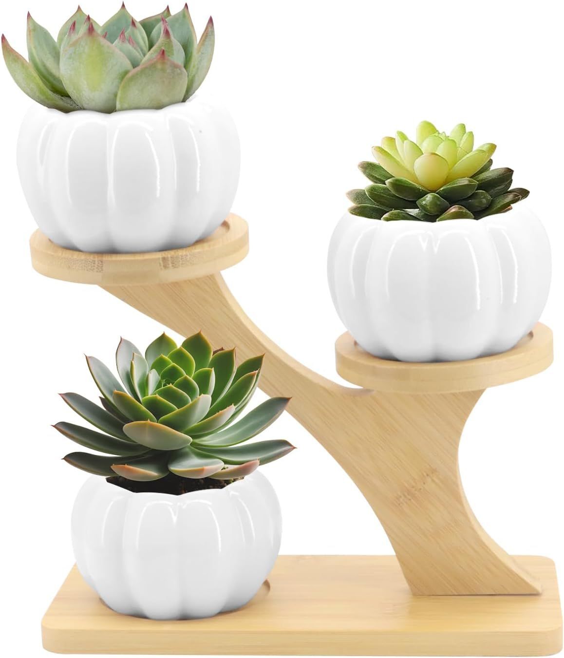 Pots De Fleurs Succulentes,En Céramique,Avec Support De Plateau En Bambou,Petits Pots De Plantation Pour Cactus À Domicile,Bureau,Décoration Windowsill (Style Citrouille Blanche)