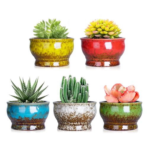 ARTKETTY Lot de 5 Petits Pots à succulentes en céramique émaillée avec Drainage pour Cactus, Fleurs et Plantes d'intérieur, 10,2 cm