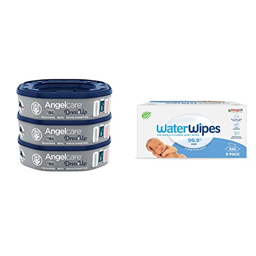 Angelcare - Dress Up - Recharges Octogonales pour Poubelle à Couche Dress up/Essential - Lot de 3 & Lingettes bébé Originales sans plastique WaterWipes, 540 pièces à base d’eau à 99,9% et sans parfum