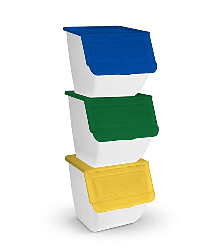 TIENDA EURASIA® Poubelle de recyclage - Lot de 3 seaux à ordures de cuisine empilables - 36L - (Papier - Verre - Plastique) (Blanc)