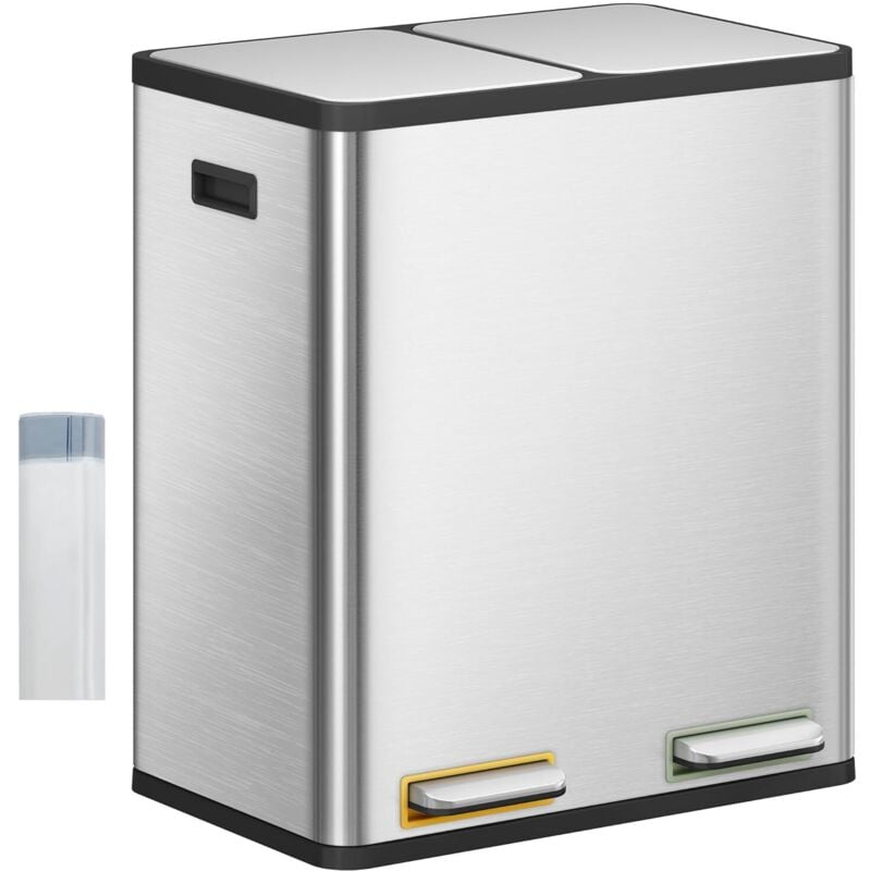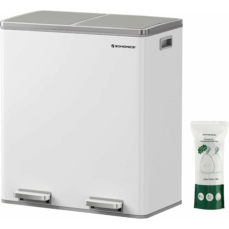 Songmics - Poubelle à Double Compartiment 2 x 30L, avec 15 Sacs Poubelles, Pédales en Métal, 2 Seaux Intérieurs en Plastique, Couvercles, Poignées,