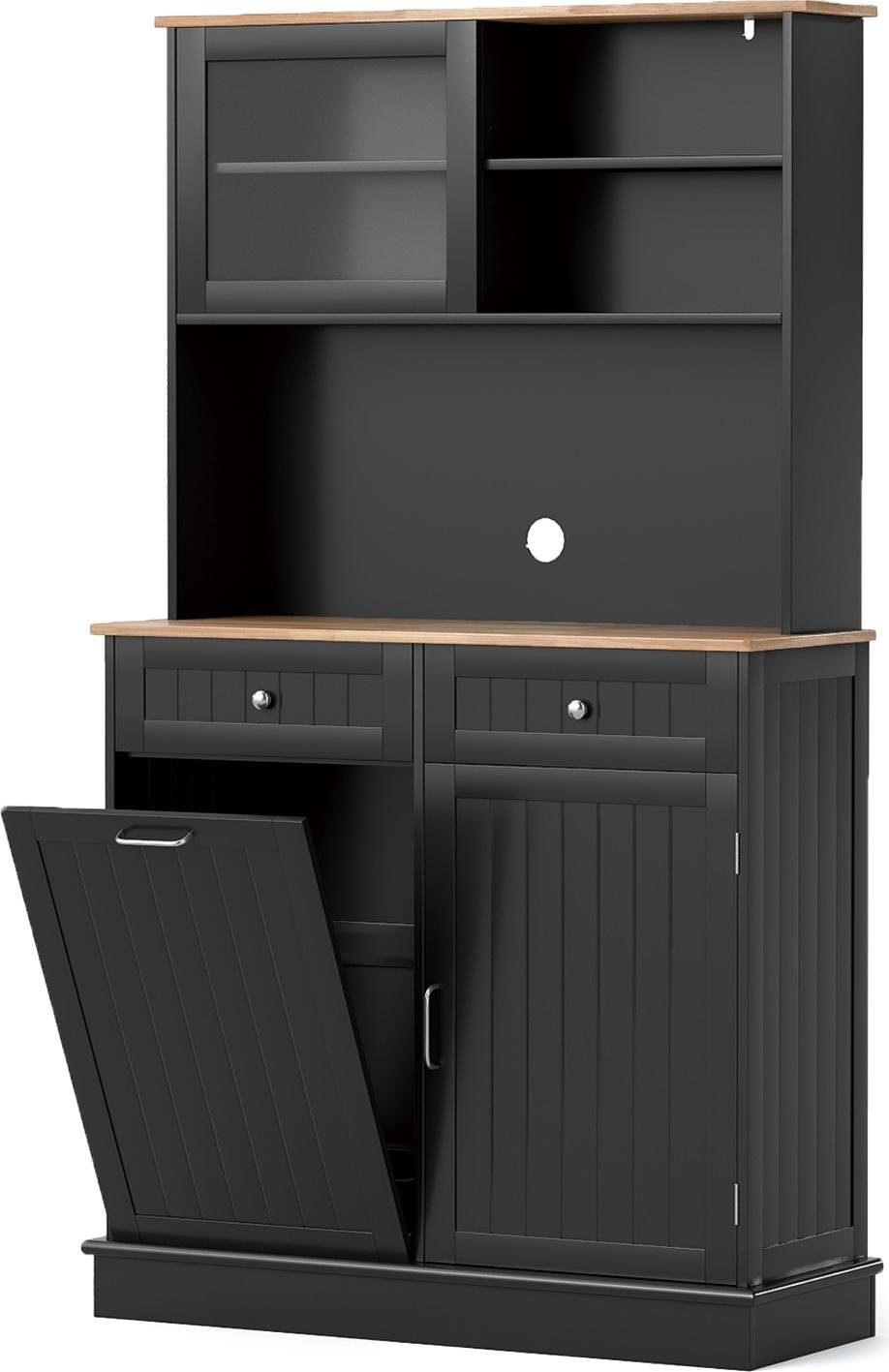 COSTWAY Armoire de cuisine, pour poubelle de 45 L, armoire buffet avec plan de travail, 2 tiroirs & étagères, armoire haute de cuisine, commode en bois, noir