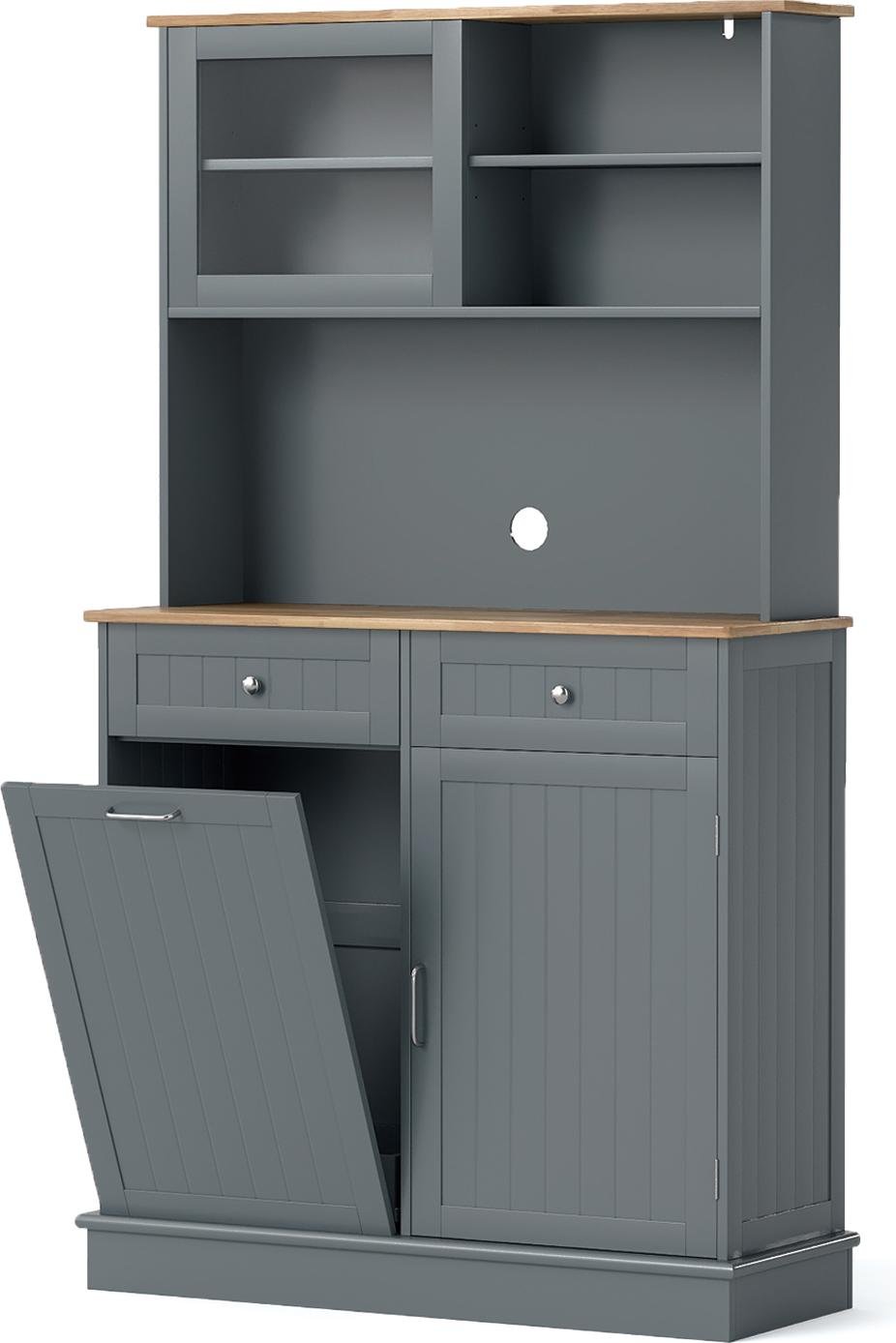 COSTWAY Armoire de cuisine, pour poubelle de 45 L, armoire buffet avec plan de travail, 2 tiroirs & étagères, armoire haute de cuisine, commode en bois, gris