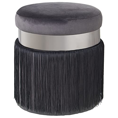 DRW Pouf Rond en Velours avec Franges et Bande en métal Gris et argenté 40 x 44 cm, Franges 29 cm