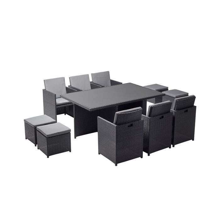 MONACO 10 - Salon de jardin encastrable 10 places fauteuils et poufs en résine tressée noir et blanc