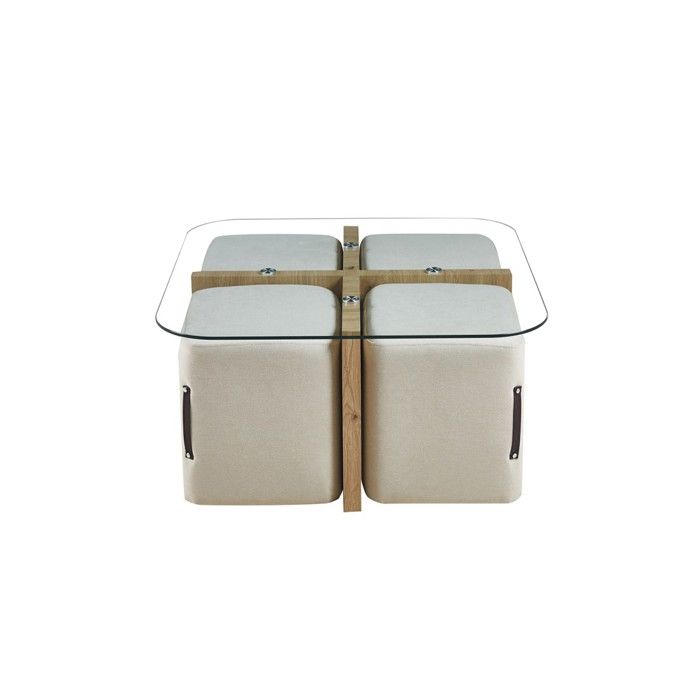 Table basse quadora – carrée 90x90 cm – verre & chêne vieilli – avec 4 poufs blancs – design pratique et élégant