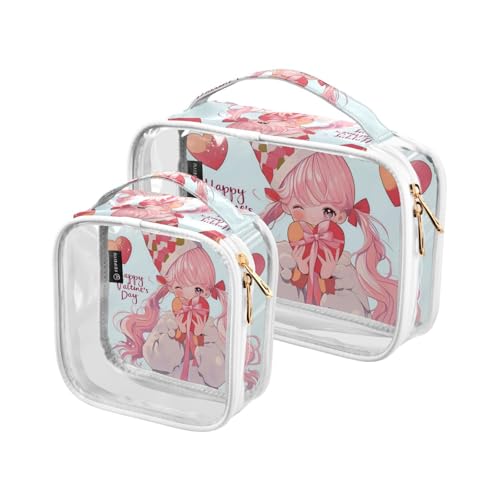 Amooorous Lot de 2 trousses de toilette décoratives transparentes pour femme - Approuvées par la TSA - Multifonctions - Pour sac à main - Kit de rasage pour homme, valentine anime mignon poupée, 1