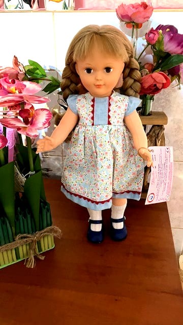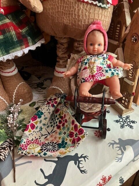petitcollin poupee neuve bonnet rose robe liberty corps mou