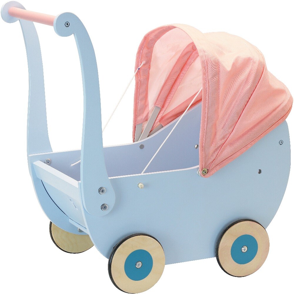 Landau en bois bleu ciel avec capote rose pour poupée - Petitcollin 800217