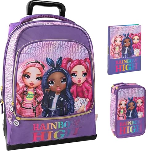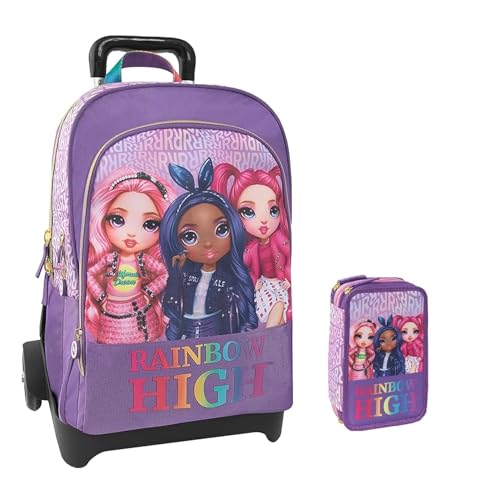 PRESTIGE & DELUXE Sac à dos Trolley Rainbow High Violet, 2 compartiments, bretelles rembourrées, pour fille, écoles élémentaires et moyennes + trousse 3 étages + porte-clé pailettes et 7 stylos