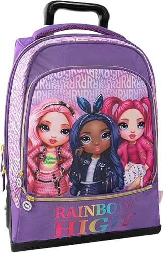 PRESTIGE & DELUXE Sac à dos Trolley Rainbow High Violet, 2 compartiments avec fermeture éclair, bretelles rembourrées, pour fille, écoles élémentaires et moyennes + porte-clé à palettes et 7 stylos