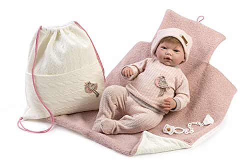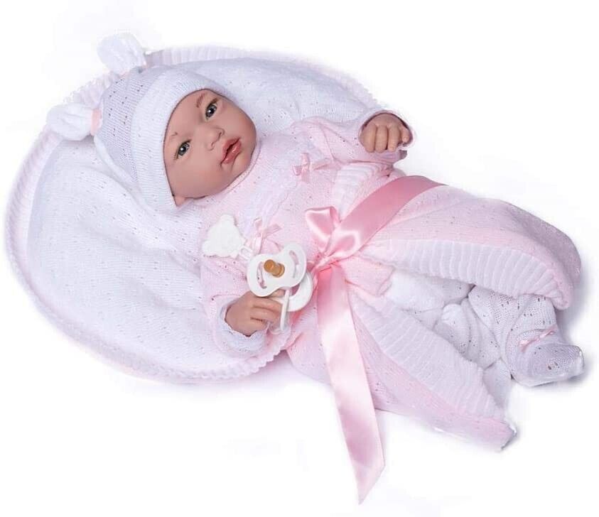ARIAS Poupée Reborn Lola de 40 cm, avec Habits Blancs et Bonnet et nacelle Rose, bébé Nouveau-né avec Corps en Vinyle, Accessoires, Couches, tétine et tétine, Jouet pour Enfants à partir de 3 Ans