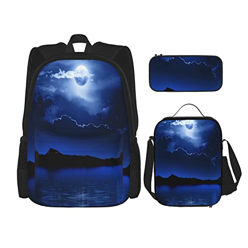 3 pièces ensemble sacs à dos lune et nuages sur l'eau calme paysage marin dramatique nuageux ciel sombre sac de livre voyage travail sac d'école trousse à crayons sac à déjeuner combinaison pour hom