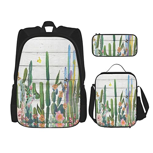 3 pièces ensemble sacs à dos américain sud-ouest plante fleurs vintage aquarelle cactus cactus papillon sur bois rustique rétro bois fantastique sac d'école trousse à crayons sac à déjeuner pour hom
