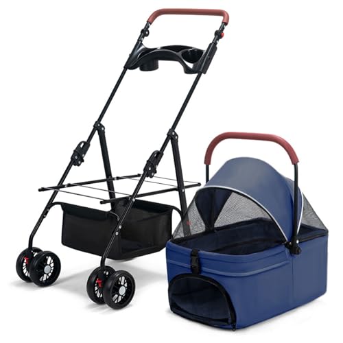 Poussette Chien Pliable 3 en 1, Sac De Transport Amovible, Porte-gobelet Multifonction, Roue Universelle À 360°, Panier De Rangement Extra Large, for Animaux De Compagnie(Bule)