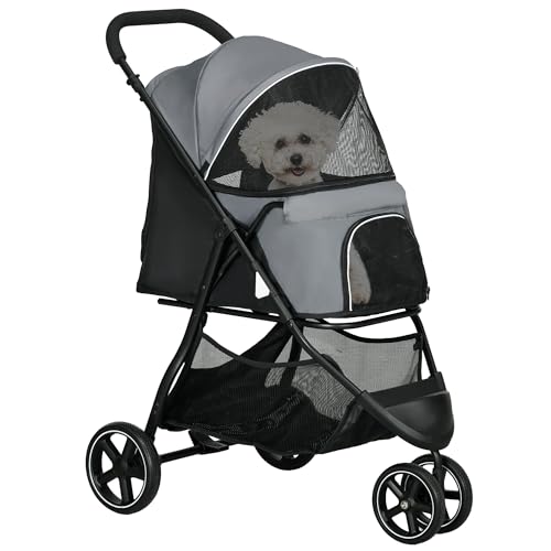 PawHut Poussette buggy pour chien, poussette pour chat animaux de compagnie pliable, 2 laisses, roues EVA, guidon réglable, panier, 83 x 55 x 101 cm, gris