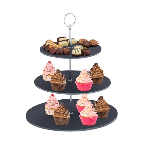 Relaxdays Présentoir apéritif, 3 étages, ardoise, serviteur gâteau, poignée en métal, HxD 34 x 30 cm, anthracite/argent