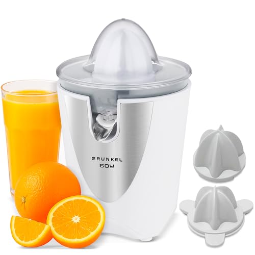 Grunkel - Presse-agrumes électrique pour oranges ou agrumes - Deux cônes interchangeables - Embout en acier inoxydable - Filtre à pulpe (blanc)