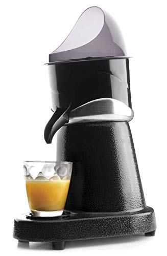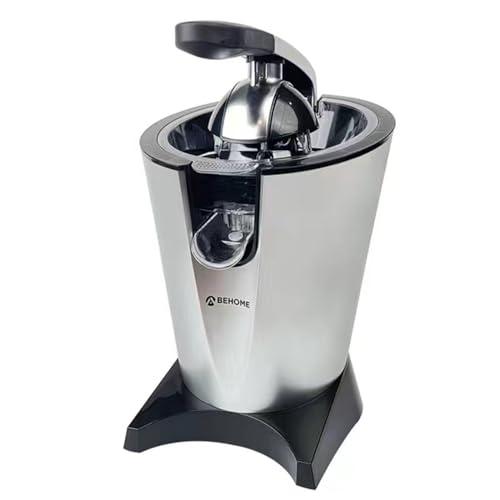 BEHOME Presse-agrumes électrique professionnel 2 litres | Presse-agrumes à levier avec bras et bec verseur | 2 cônes en acier inoxydable pour l'orange et le citron et filtre interne, noir et argenté