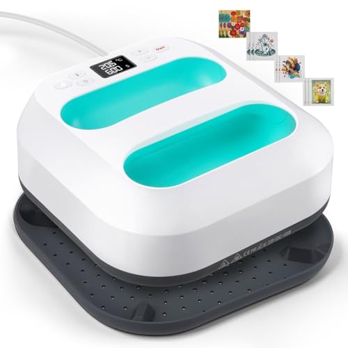 Presse a Chaud Textile, 22.5x22.5CM (9x9inch) Presse à Chaud Portable avec Minuterie et Contrôle de la Température (100-205°C), Transfert Rapide des Textiles, 12 Autocollants Inclus
