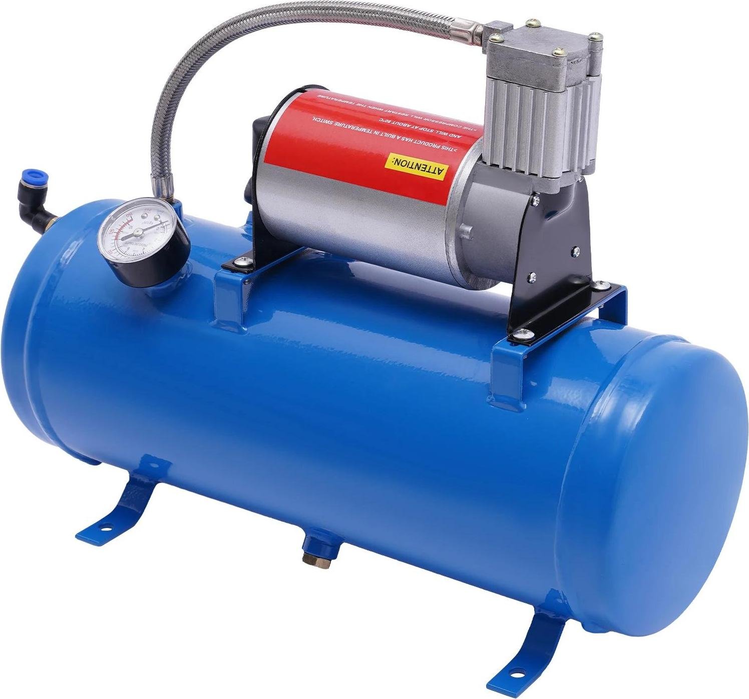 Compresseur d'air 12 V CC - Kit compresseur avec corne de brume - 150 PSI - Réservoir sous pression de 6 l - Tuyau de 3,8 m - Pressostat 90/120 PSI - Manomètre - 23 A - Bleu
