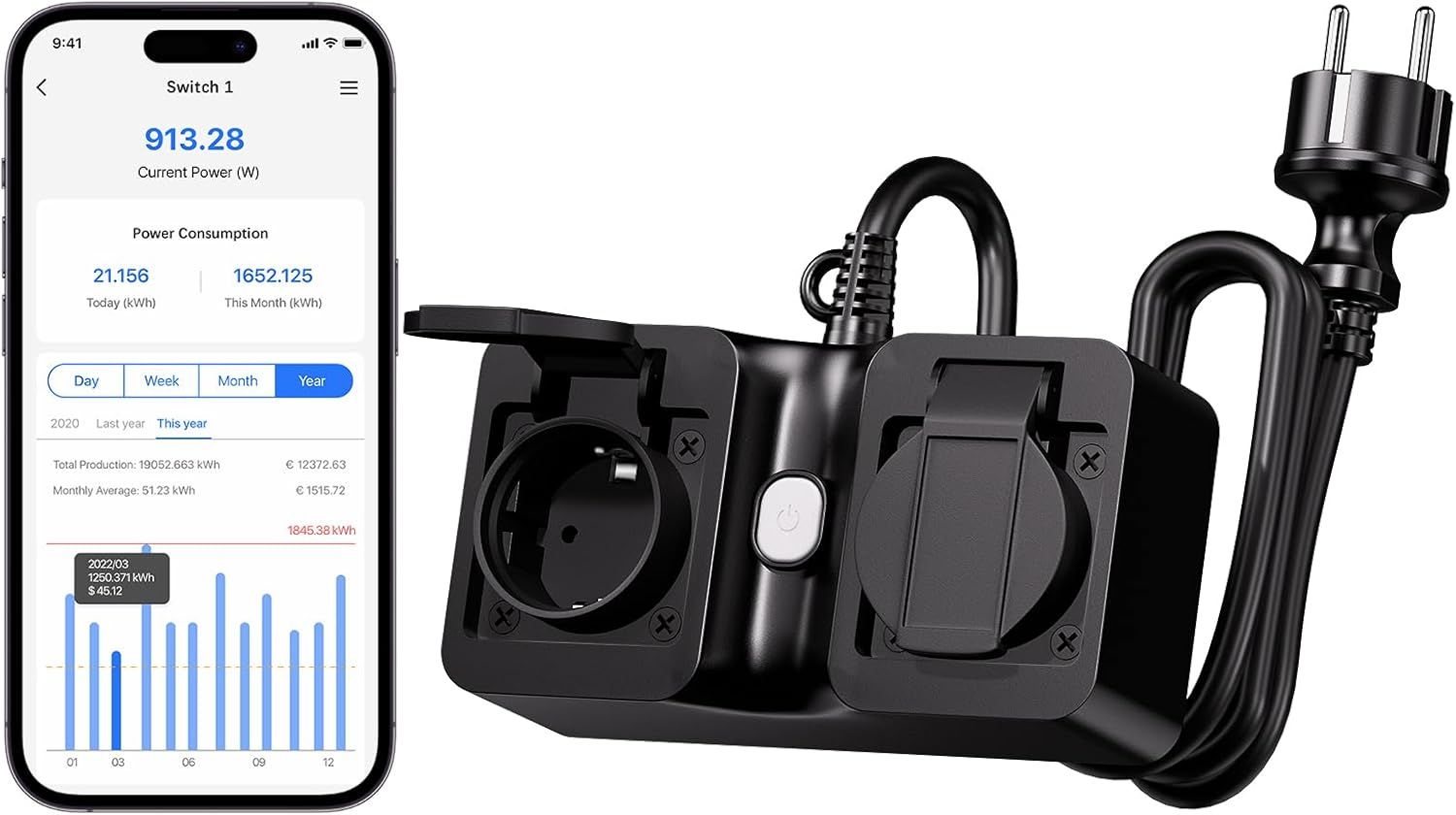 JEXNOVASHOP-Meross Multiprise Connectée Extérieure (Type F), Prise WiFi Étanche IP44 Compatible avec Apple Home, Alexa et Google Home, Suivi de Consommation d'Énergie, Commande Vocale et Contrôle à D