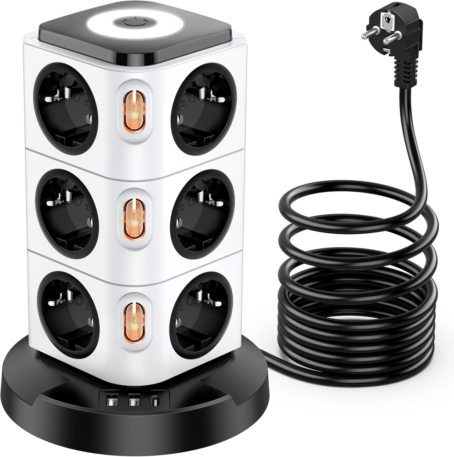 JGD-Multiprise Electrique, 12 Compartiments Multiprise avec USB, Multi Prise de Protection Contre Les Surtensions Tower avec 4 Interrupteurs, Veilleuse Design Originale et USB-A, USB-C Câble 3M