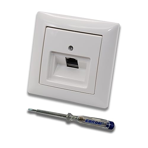 Busch Jäger, Rutenbeck Prise réseau encastrée Ethernet 10 Gigabit/S (10GbE) KAT6A 6A - 1 connecteur RJ45 dans BalanceSi cadre blanc alpin et cache UAE avec testeur de phase EBROM pour le montage de