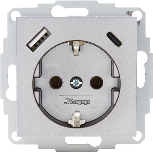 Kopp ATHENIS Prise encastrée avec USB A et USB C en gris mat - Prise de contact de protection avec prises de charge intégrées - 16 A/250 V~ IP20 - Bornes enfichables et protection de contact accrue