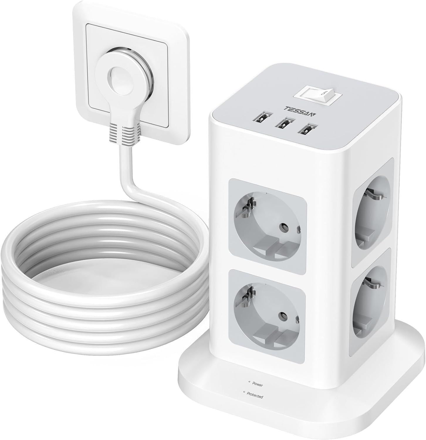 TESSAN Multiprise avec Interrupteur, Rallonge Électrique 10M, Tour Multiprise avec USB C et 3 USB A, Prise Électrique 3600W, Prise Parafoudre et Surtension, pour Bureau Studio Cuisine, Noire